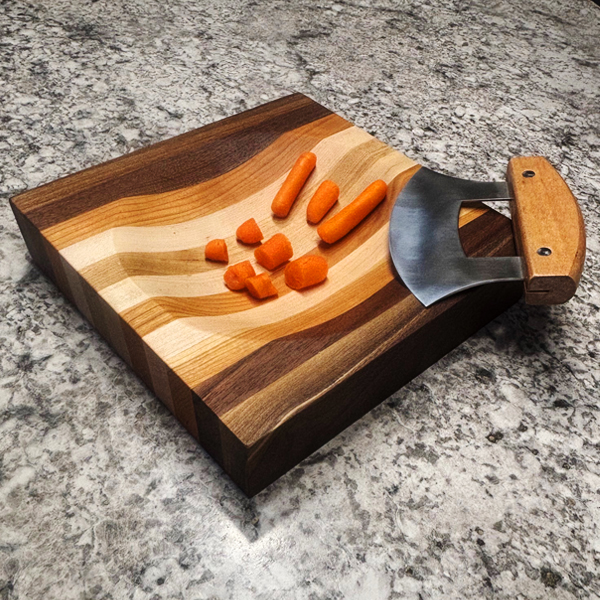 Crafted from premium Black Walnut and Hard Maple, this stunning cutting board is both functional and stylish. Treated with food-grade mineral oil and natural waxes, it’s built to last and gentle on your knives. Featuring rubber legs for stability and beveled edges for easy handling, this board is perfect for everyday kitchen use.